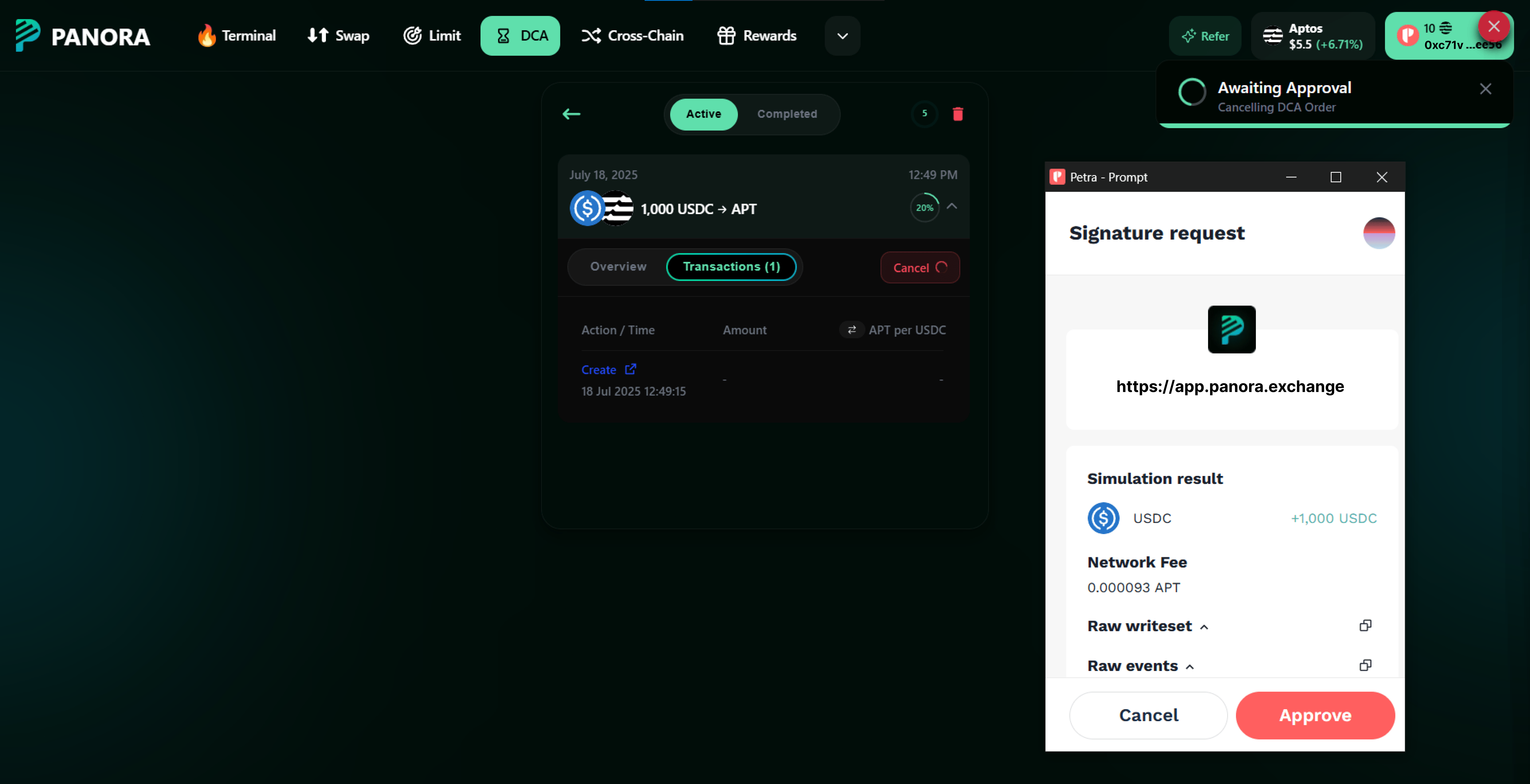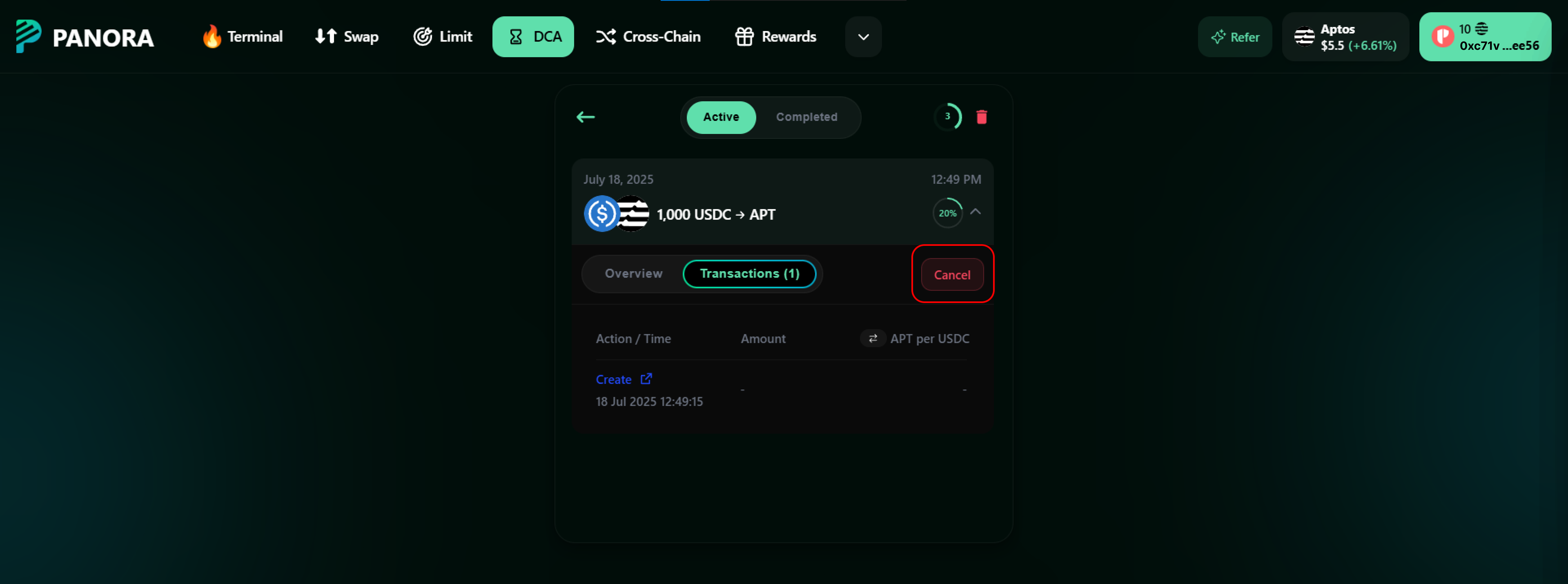 You can easily configure the amount, frequency, and duration of your DCA strategy — or cancel through [*Panora’s intuitive interface*](https://app.panora.exchange/dca).